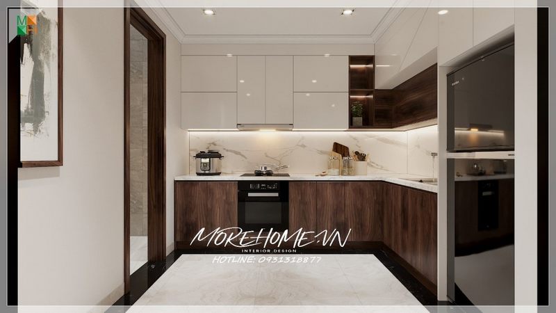 Thiết kế nội thất cho phòng bếp của căn hộ chung cư với các đồ nội thất được bố trí hợp lý và tiện dụng.