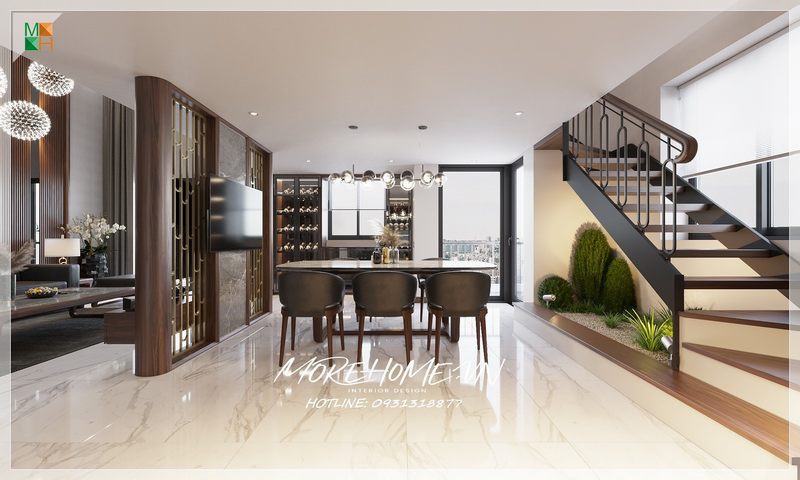 Mẫu thiết kế nội thất phòng ăn của Starlake Tây Hồ mang phong cách hiện đại với sự kết hợp giữa gỗ óc chó nhập khẩu và không gian biệt thự luxury.